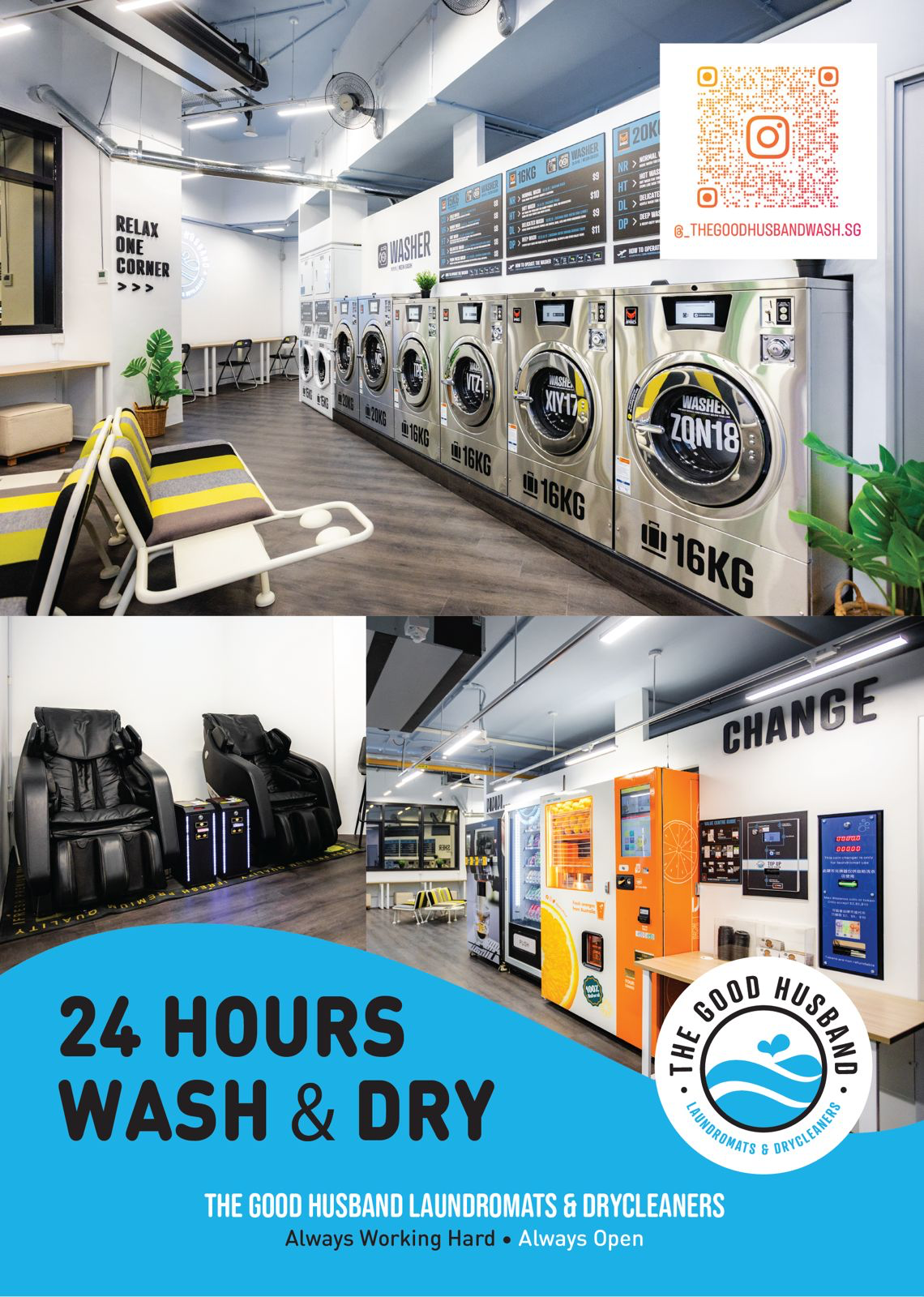 Don’t take our word for it, come on in and experience it for yourself! Warmly welcoming you to The Good Husband Laundromats & Drycleaners. Always Open. Always Working Hard.